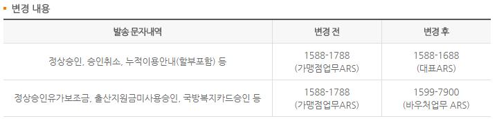 문자를 받으신 후 고객님께서 전화하실 경우 신속한 ARS 조회 및 업무별 상담원을 원활하게 연결해 드리기 위해 승인내역 문자발송 회신번호를 KB국민카드 대표 ARS 1588-1688로 변경 하오니 이용에 참고하시기 바랍니다.