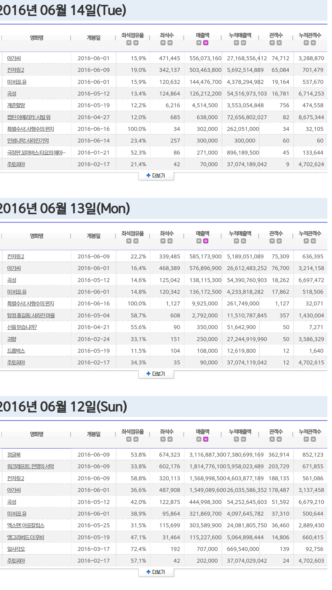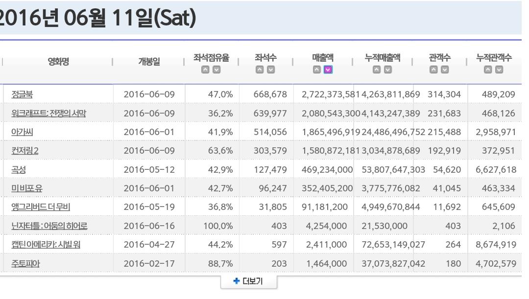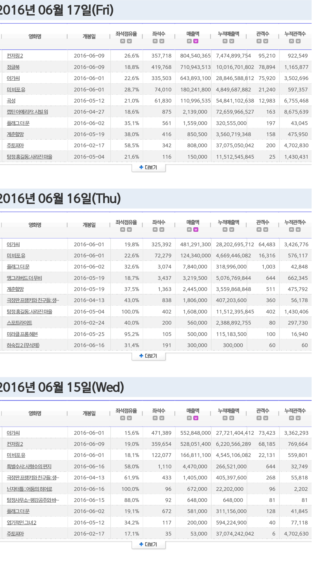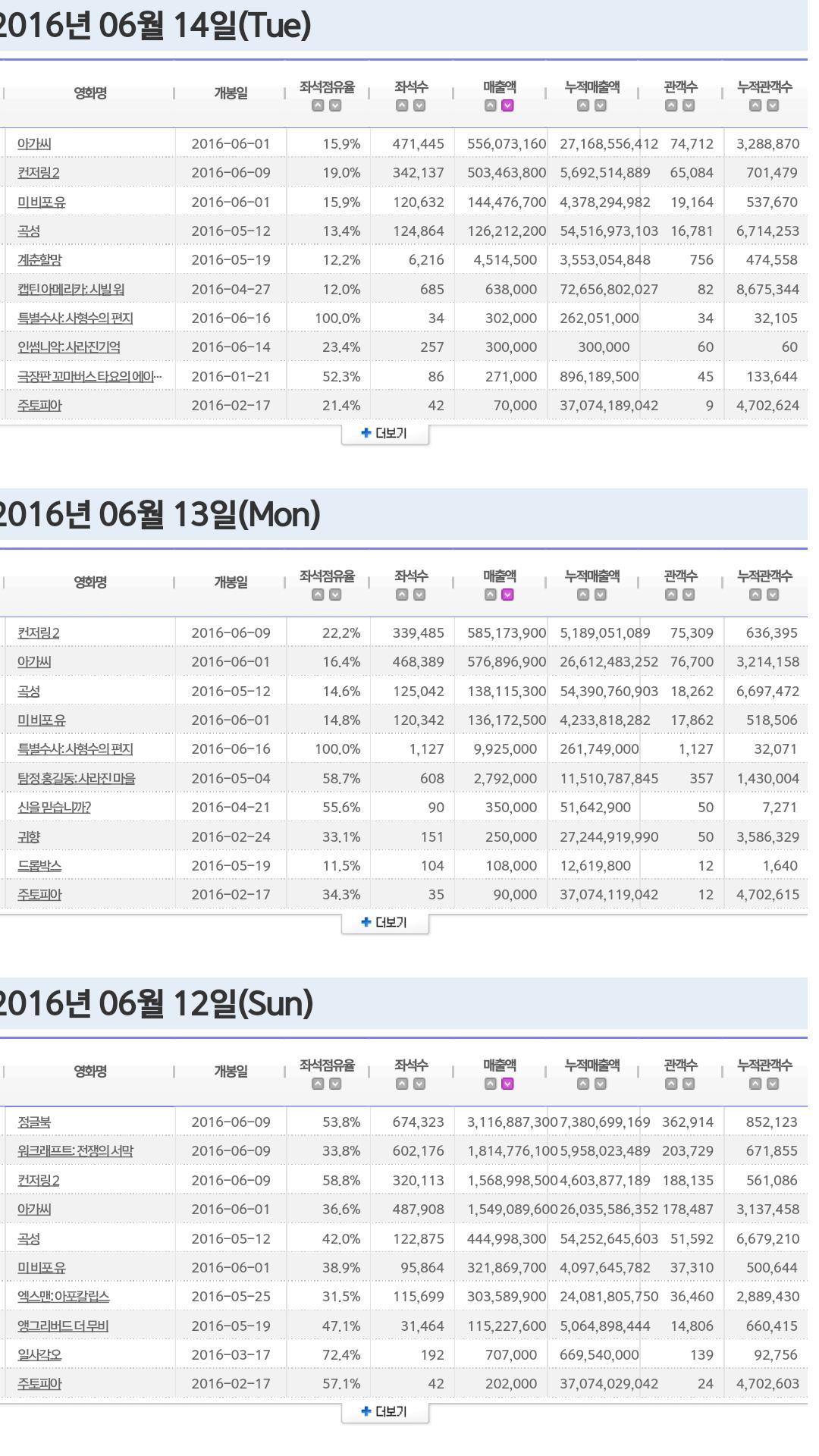지난주 각 영화별 일자별 매출 순위 > 영화포럼