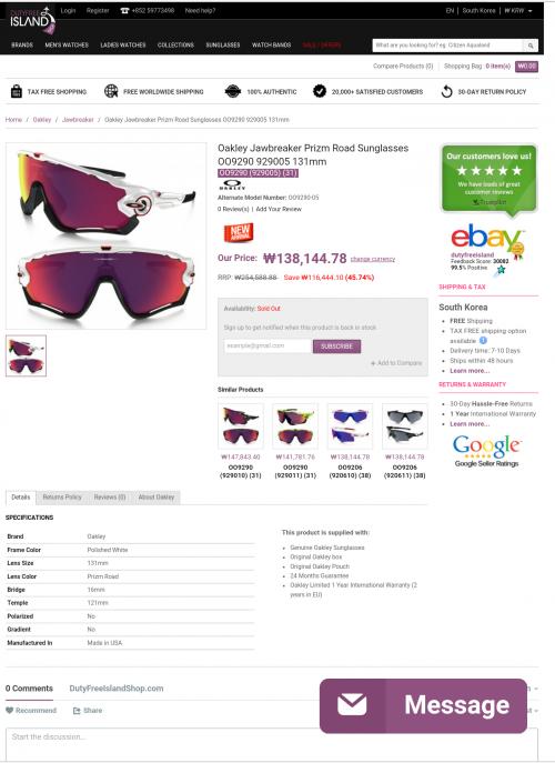 라이딩할때 필요한고글을 찾는데 오클리 조브레이커가 멋지더군요 국내에서 사보려했는데 국내정발가격이 20만이 넘더라구요ㅜㅜ 절망하다 조마샵 면세섬을뒤지던중 면세섬에서 제가찾는걸 발견했는데 품절이더군요 실망해서 영화한편보고 혹시나하는 맘에 다시면세섬에가봤더니 재고가 채워진건지 인스톡 이더군요 잽싸게 지르고 어제수령했습니다 한국까지 직배무료배송이구요 6월1일에구매해서 6월3일에 한국도착했는데 6월7일에배송받았습니다 우체국택배로와서 공휴일이 겹쳐서 한국에서 시간이 더걸렸네요ㅜㅜ 근데포장이 박스포장이아니고 폴리백포장이라 선글박스박스가 많이상했네요.. 간간히 재고풀리는거같으니 필요하신분들은 한번 둘려보셔도 좋을거같습니다~마무리는 구매인증사진으로 대체하겠습니다좋은하루되세요~