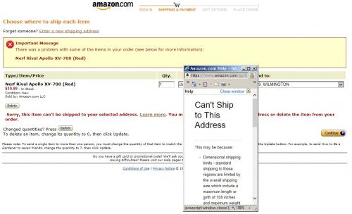 아마존에서 위 주소의 너프 장난감 총을 구매 하려고 하는데 쉽 어드레스 넣으면 아래와 같은 메세지가 나오네요.
