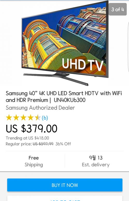 ebay에서 삼성 40인치 UHD 스마트 티비를 379불에 판매중이네요.