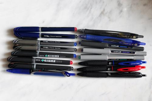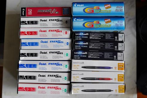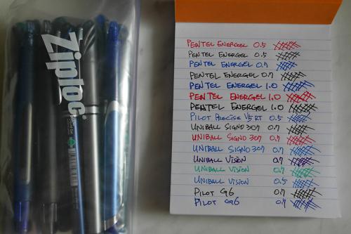 파이로트 G6는 미국에서 가장 많이 팔린다는 G2의 몸통만 두꺼워진 버전이구요. 마음에 드는 건 유니볼 307하고 파이로트 Precise V5 두 가지네요. 펜텔 에너젤도 잘 써지긴 하는데 물기에 너무 쉽게 번지는 단점이 있군요.
