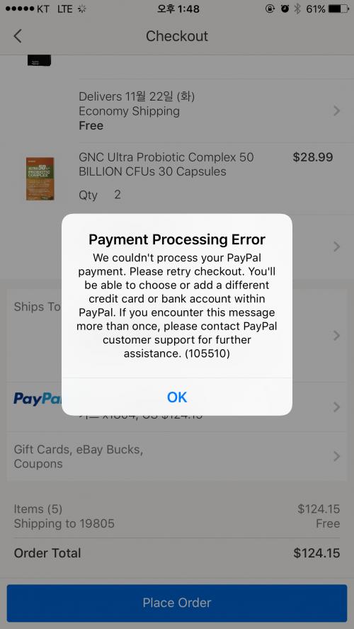 지엔씨 영양제좀 구입할려고 하는데 모바일에서 저렇게 해서 안되길래 이베이 계정도 바꿔보고 페이팔도 바꿔보고 다 했는데 결국 안되네요...
