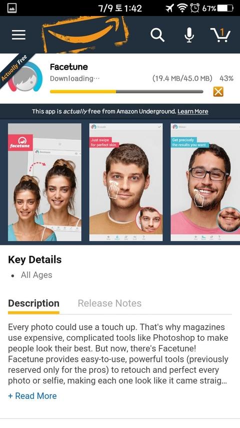 여기에서 Amazon Underground를 먼저 다운 받고 로긴 후에 Facetune 앱을 검색해서 설치하면