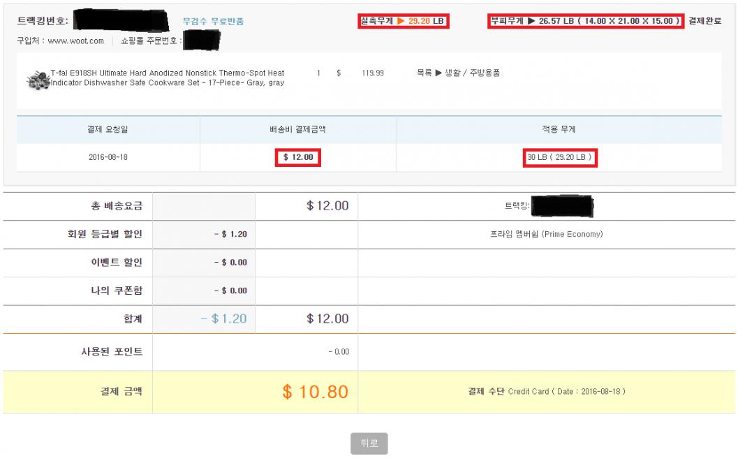 억..저는 22달러 나왔는데..실측무게 ▶ 32.90 LB 부피무게 ▶ 55.63 LB ( 26.00 X 21.00 X 16.00 )