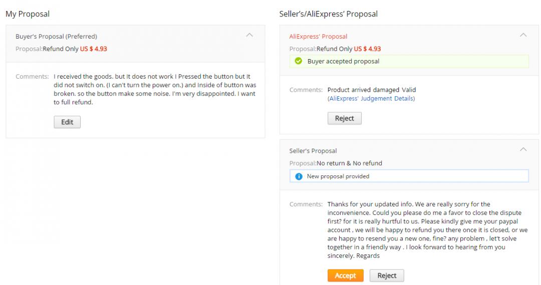 알리 제안은 전액 환불로 'Accept' 를 눌렀습니다.