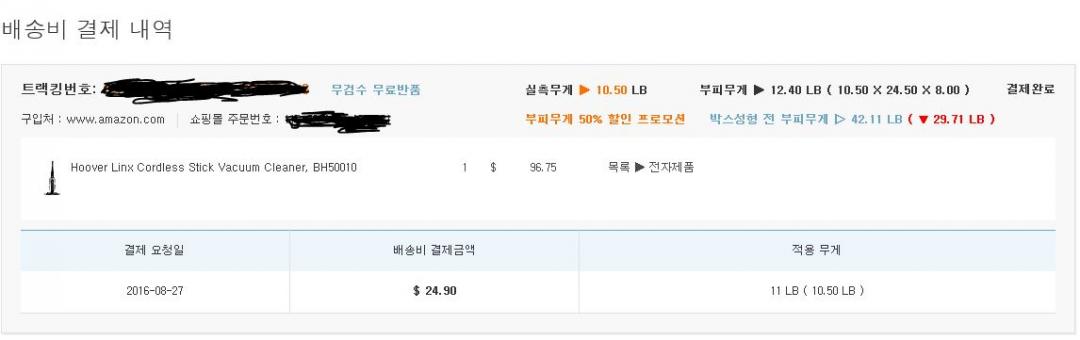 뽐X에서 아마존 Hoover 청소기 배송 시 부피무게 폭탄을 받을 수도 있다고 해서