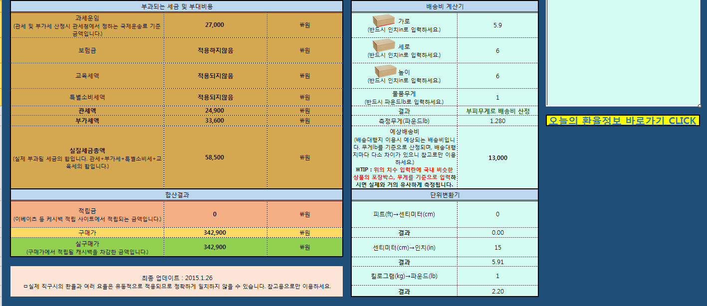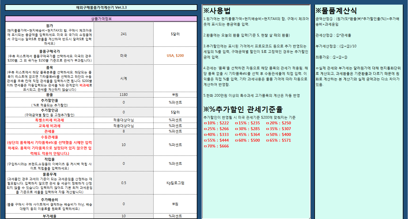 주요 기능은 관부가세 비롯 세금 계산, 캐시백적립율 및 적립금 계산, 추가할인율 계산, 단위변환, 배대지 비용 대략 조회 등입니다.