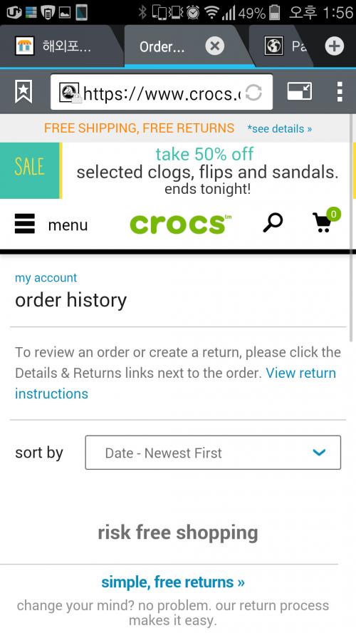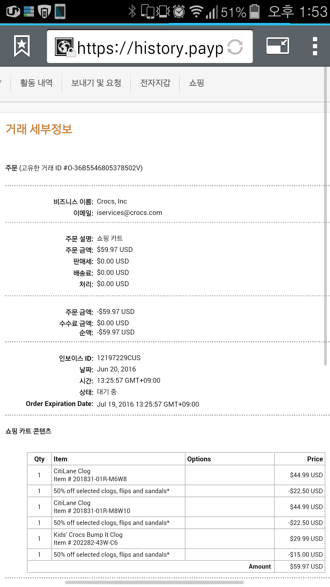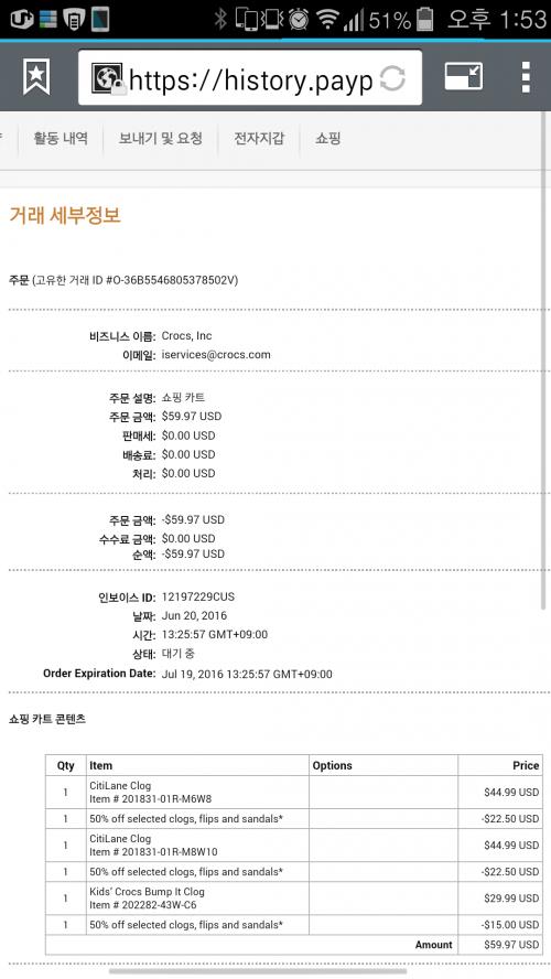 아직 결재된 상태는 아니고 매입요청이 된 상태입니다. 페이팔 결재 카드는 마스터 체크카드로 연결되어 있습니다. 크록스 공홈에서 왜 오더 내역이 안보이는지 모르겠네요..
