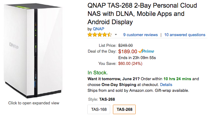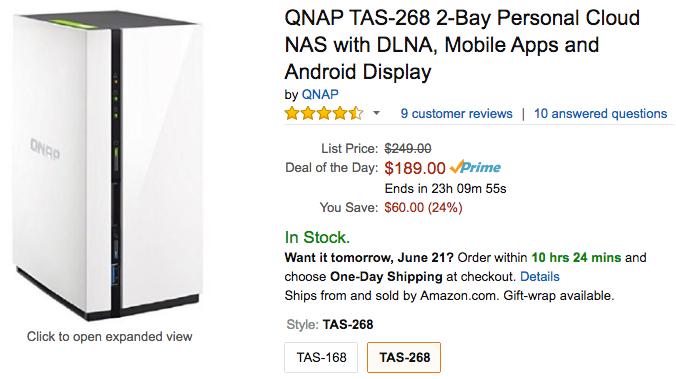 [amazon] QNAP TAS-268 2-Bay Personal Cloud NAS ($189.00, free)