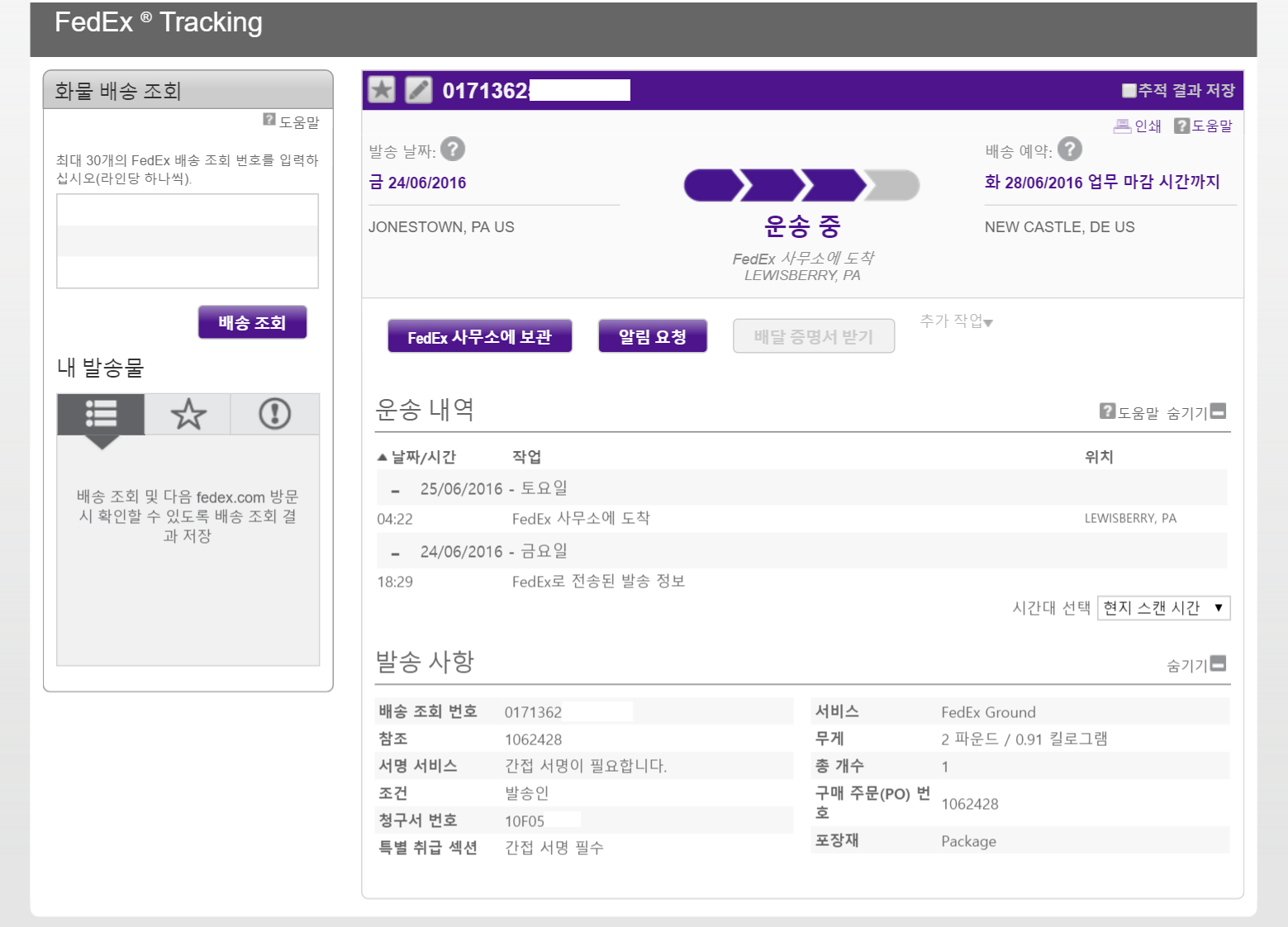 하지만 참조번호로 페덱스 조회하면 배송 중으로 나옵니다.