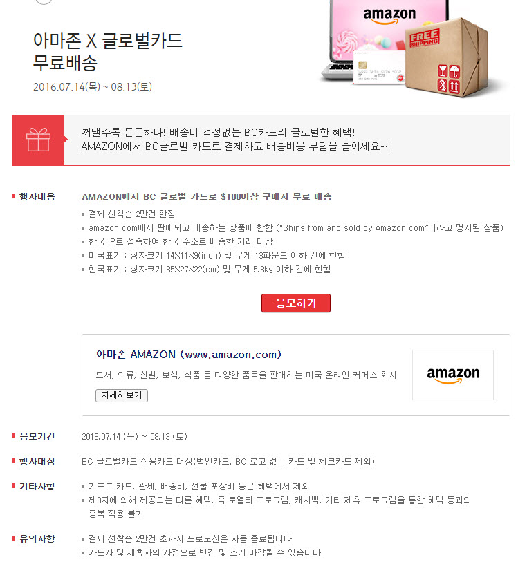 BC 글로벌카드 무배 행사는 amazon.com셀러 제품중에서 구매하는 제품이 해외배송가능한 제품이고, 전체 결제금액이 100달러 이상이면 국내까지 무료로 배송해 주는 행사입니다.