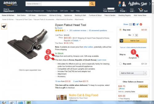무료배송 가능 품목은 셀러가 amazon.com이어야 합니다. 그림의 2번 부분 ships froma ans sold by Amazon.com 이표시가 있어야 하죠.