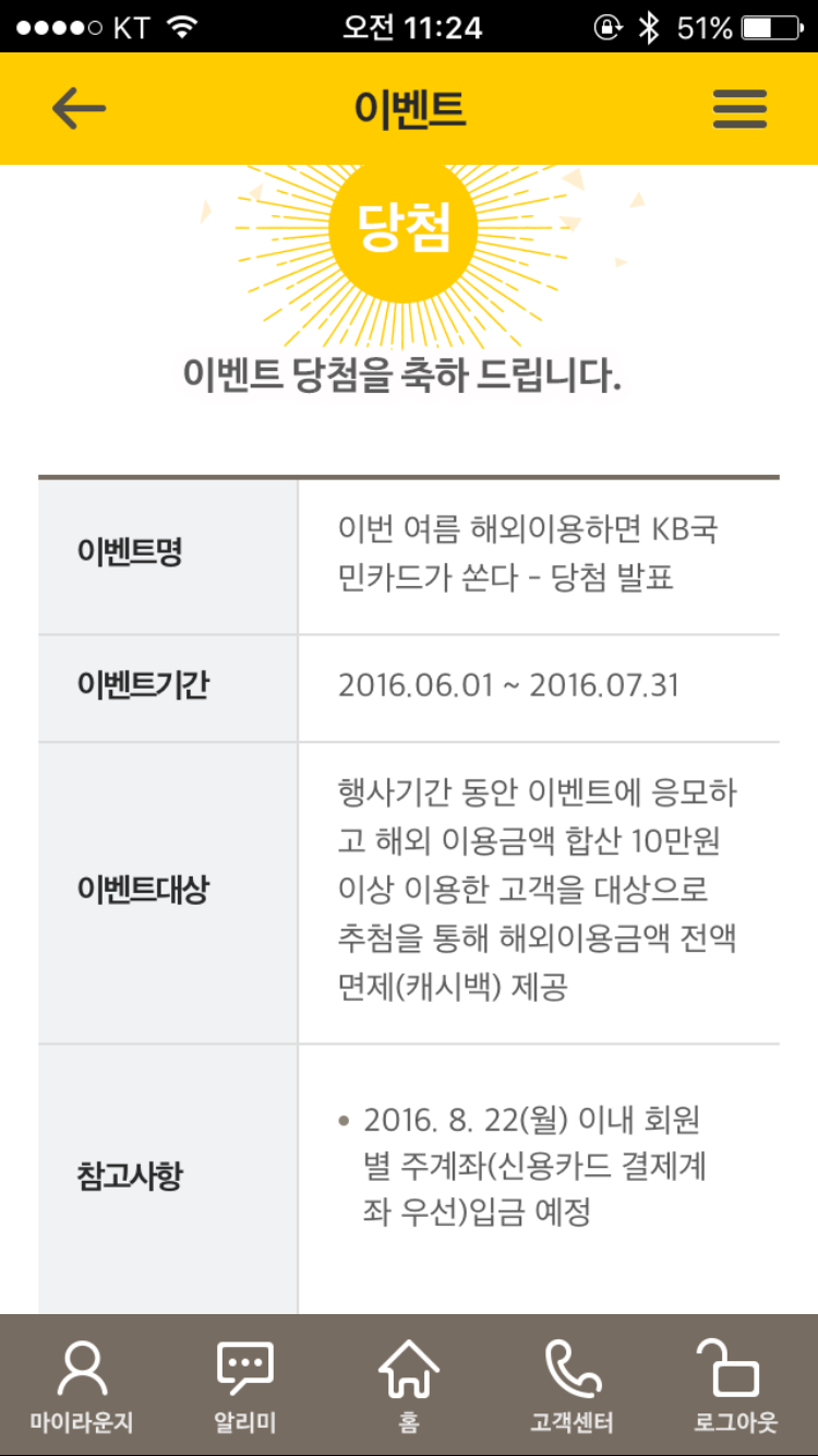국민은행 앱에서 이벤트 - my이벤트 들어가면 볼수있어요