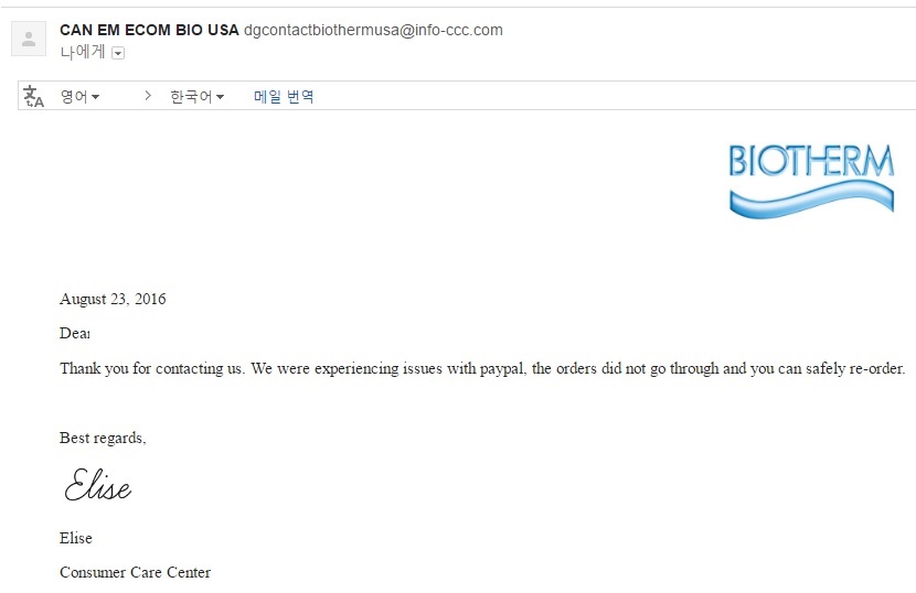 메일로 문의하니, 페이팔과 문제가 있었다며 다시 주문해보라는 연락.