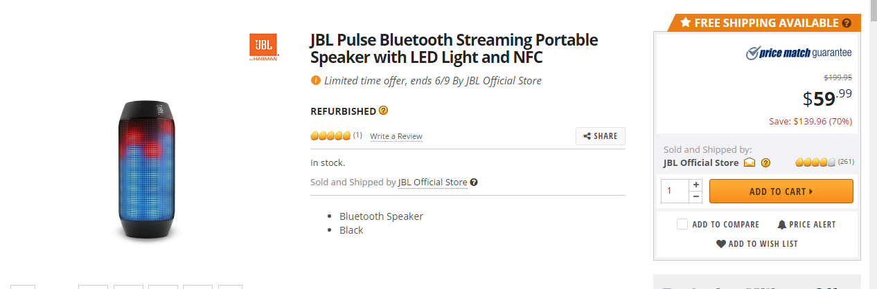 JBL Pulse Bluetooth Streaming Portable Speaker with LED Light and NFC (59.99$) > 해외포럼
