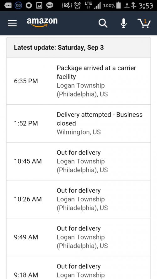 어제가 미국노동절이라 배대지가 휴무였을겁니다. 내일 재배송할겁니다. 걱정마시길.. | ||