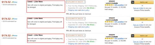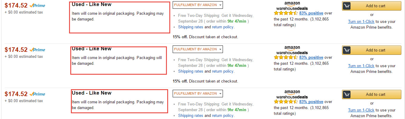 빨간 네모 안의 설명처럼 "Item will come in original packaging. Packaging may be damaged" 표기가 되어 있는제품이 박스 훼손 제품들입니다.