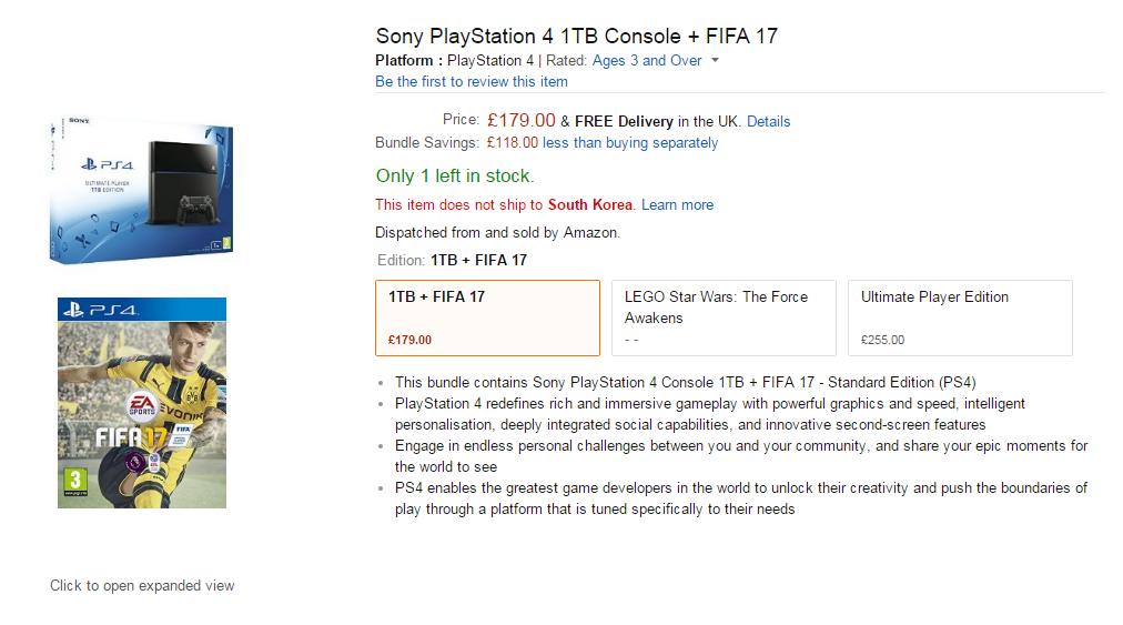 PS4 1TB + FIFA 17 번들로 179파운드에 판매하네요.