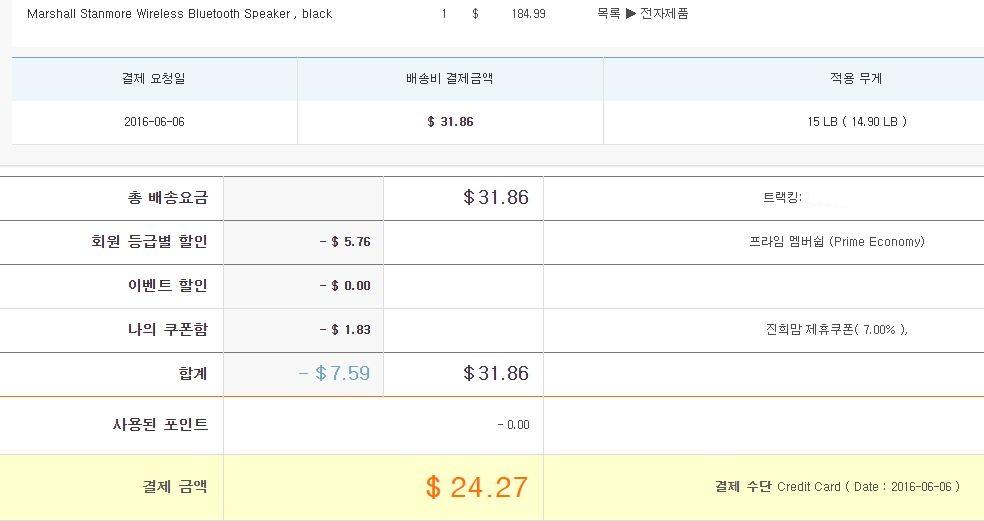 무게는 15lb 로 측정되었고, 쿠폰 쓴 최종가격은 24.27달러로 나왔습니다.