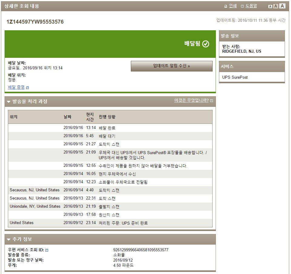 이에, 번거로우시겠지만 해당 물품 오배송 된 것으로 사료되오니 셀러측에 배송지 주소 정확히 기재하였는지 혹은 UPS 측 오배송 문의 부탁드립니다.