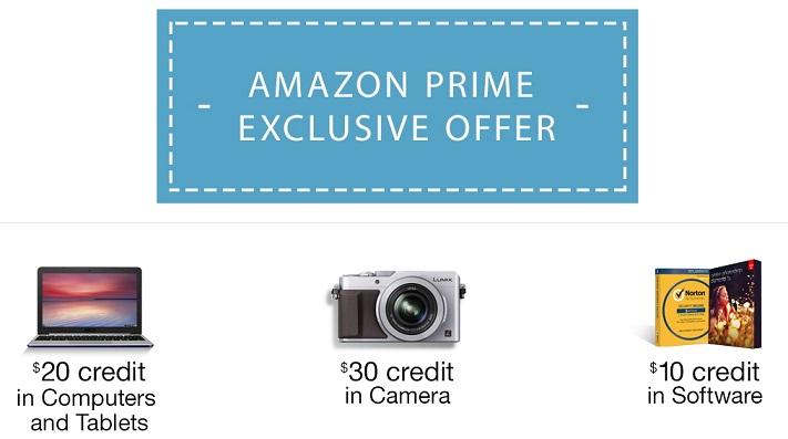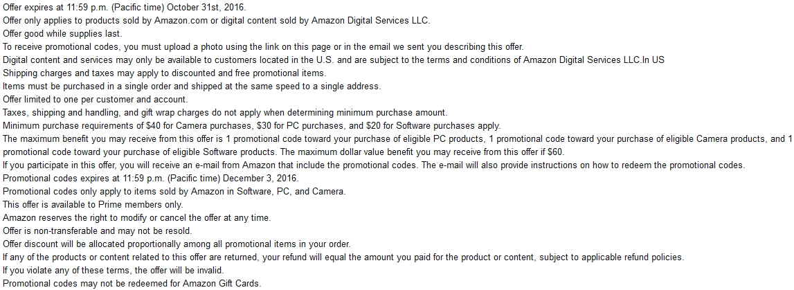 Minimum purchase requirements of $40 for Camera purchases, $30 for PC purchases, and $20 for Software purchases apply