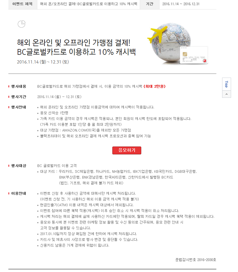 - 행사내용 BC글로벌카드로 해외 가맹점에서 결제 시, 이용 금액의 10% 캐시백 (최대 2만원)