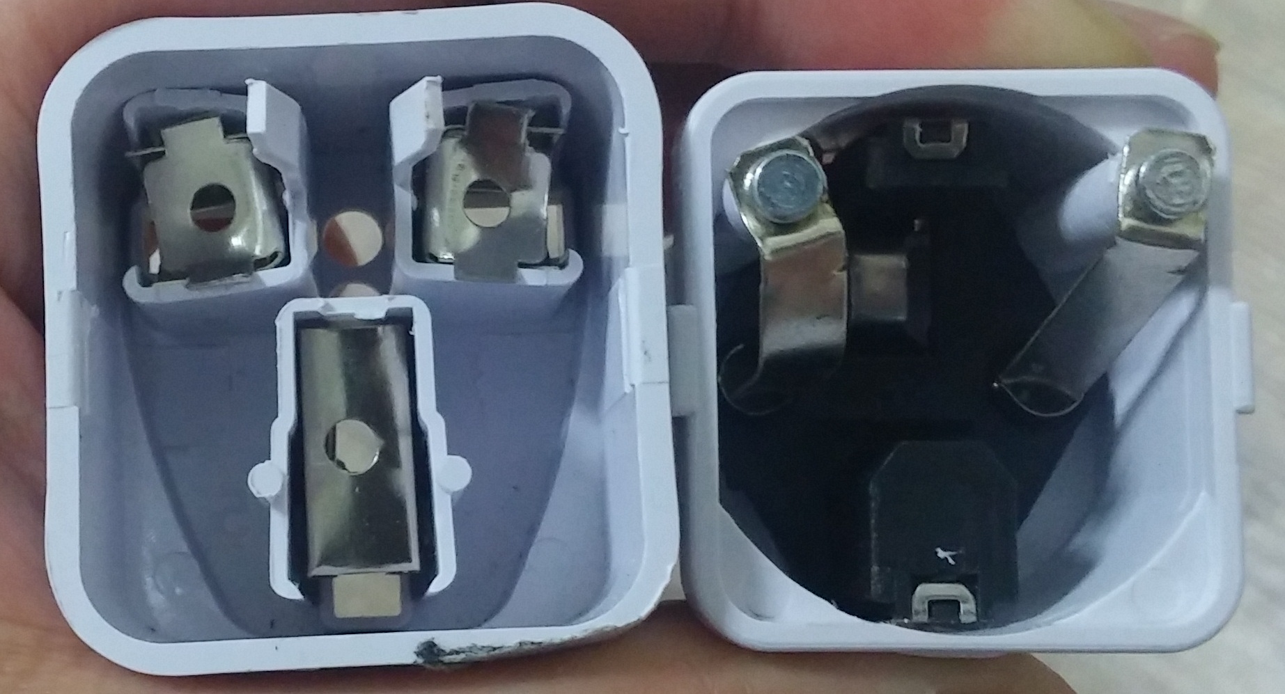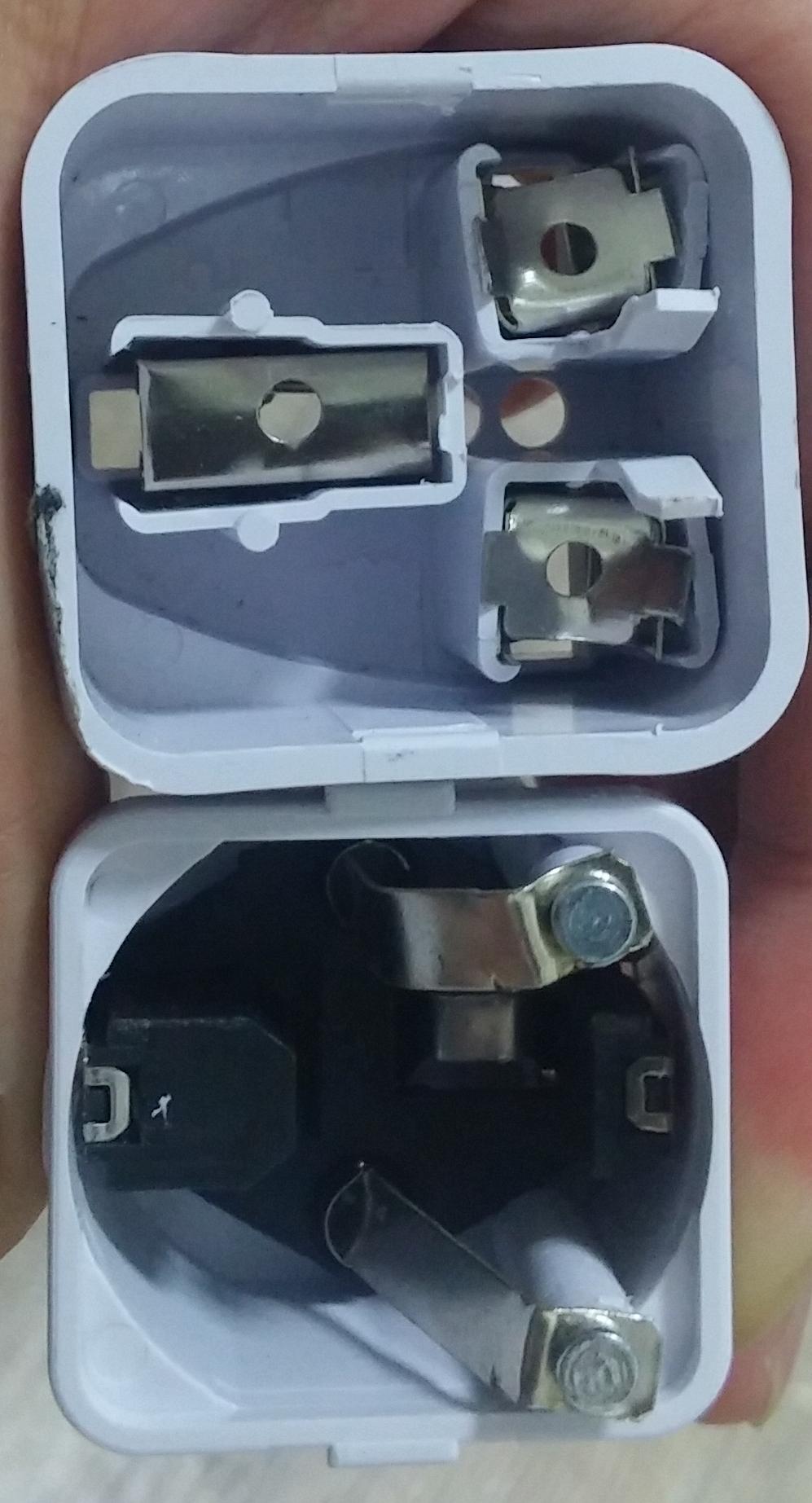 왼쪽 단자의 접지부가 아예 플라스틱으로 막혀있어요. (사진은 제거후 찍음)