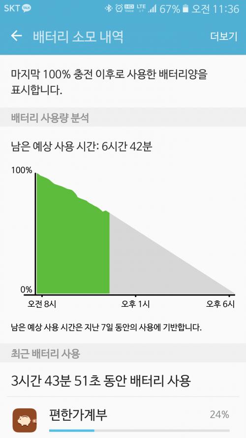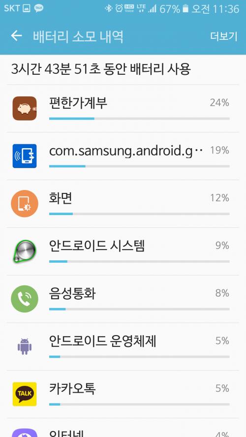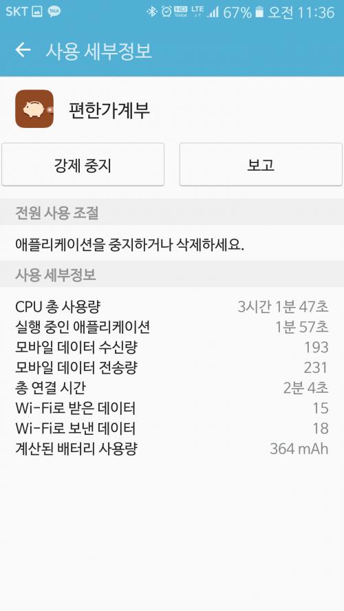 편한가계부가 수상한데요...저도 편한가계부쓰지만 저렇게 배터리 많이먹진않아요. 어플이 최적화가 덜된것일지두요.. | ||