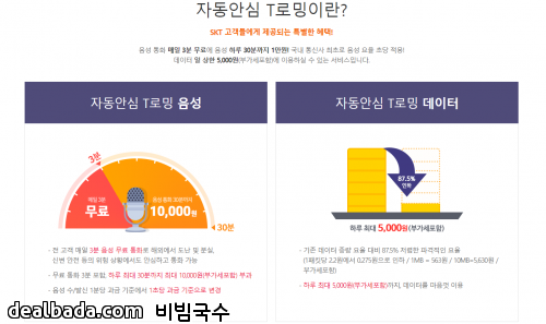 이용 시점부터 24시간 기준으로 데이터 로밍 이용료가 일 5,000원(부가세포함) 도달 시 T로밍 데이터 안심서비스에 자동 가입되며, 추가 요금 없이 200kbps 이하 속도로 이용 가능합니다. 단, 비제휴국에서 5,000원(부가세포함)초과 시에는 데이터가 차단됩니다.