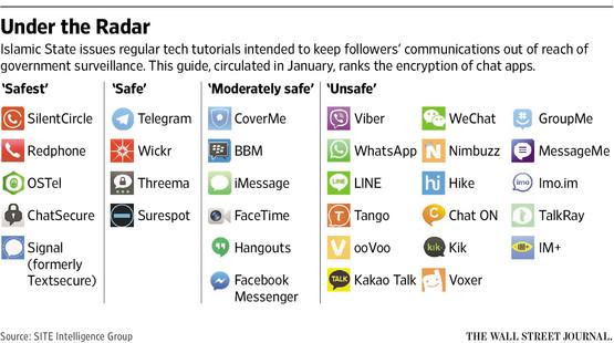 월스트리트저널은 국제 테러감시단체인 '시테(SITE)'의 자료를 인용해 IS가 주요 메신저들이 얼마나 꼼꼼하게 암호화됐는지에 따라 가장 안전, 안전, 보통, 불안전 순으로 나눴다고 보도했습니다.