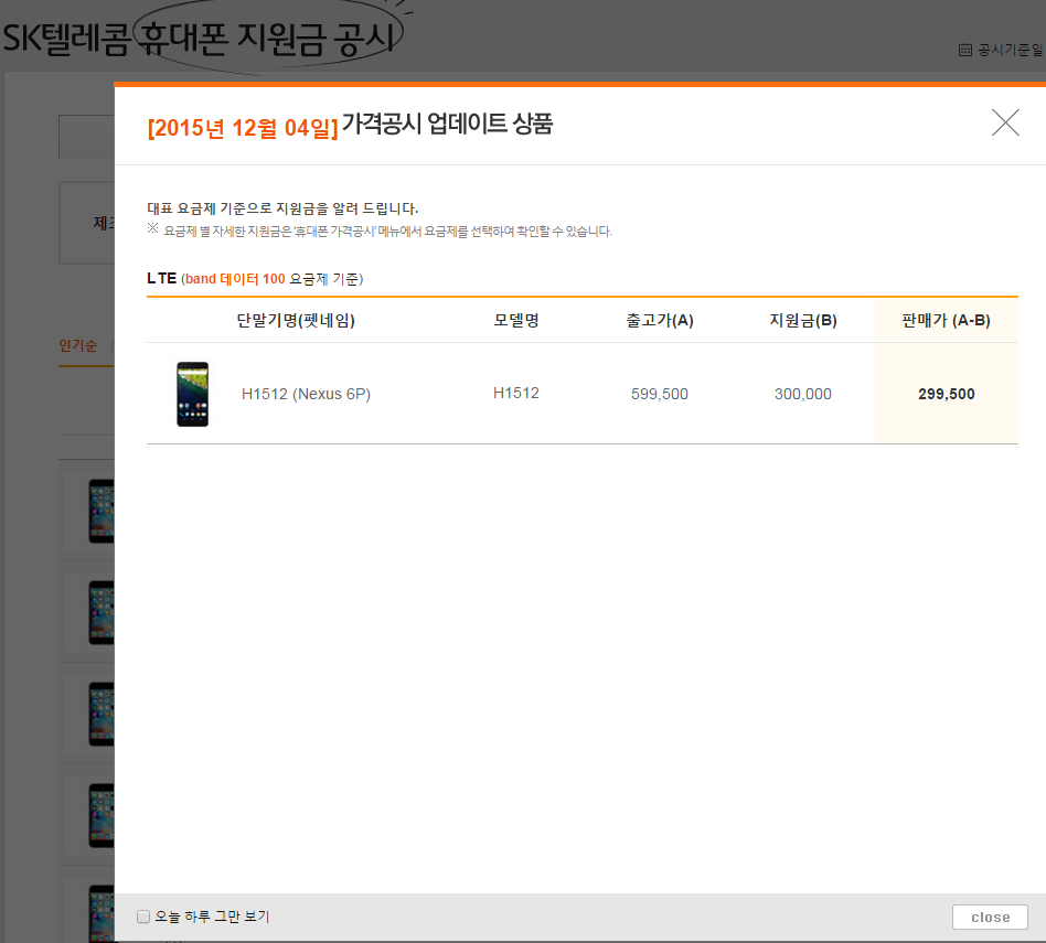 SKT 넥서스 6P 공시금 변경