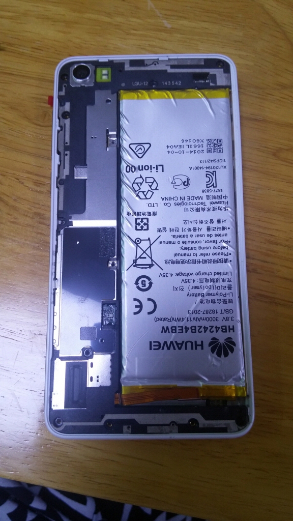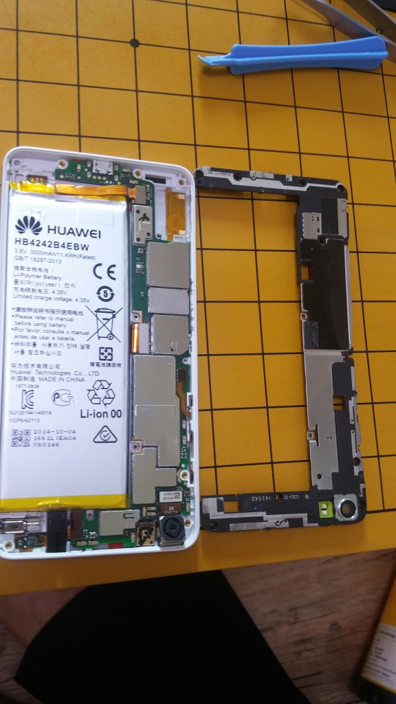 뒷판 분리 후 밧데리 글자는 잘보이지만 폰은 뒤집어진 상태입니다.~