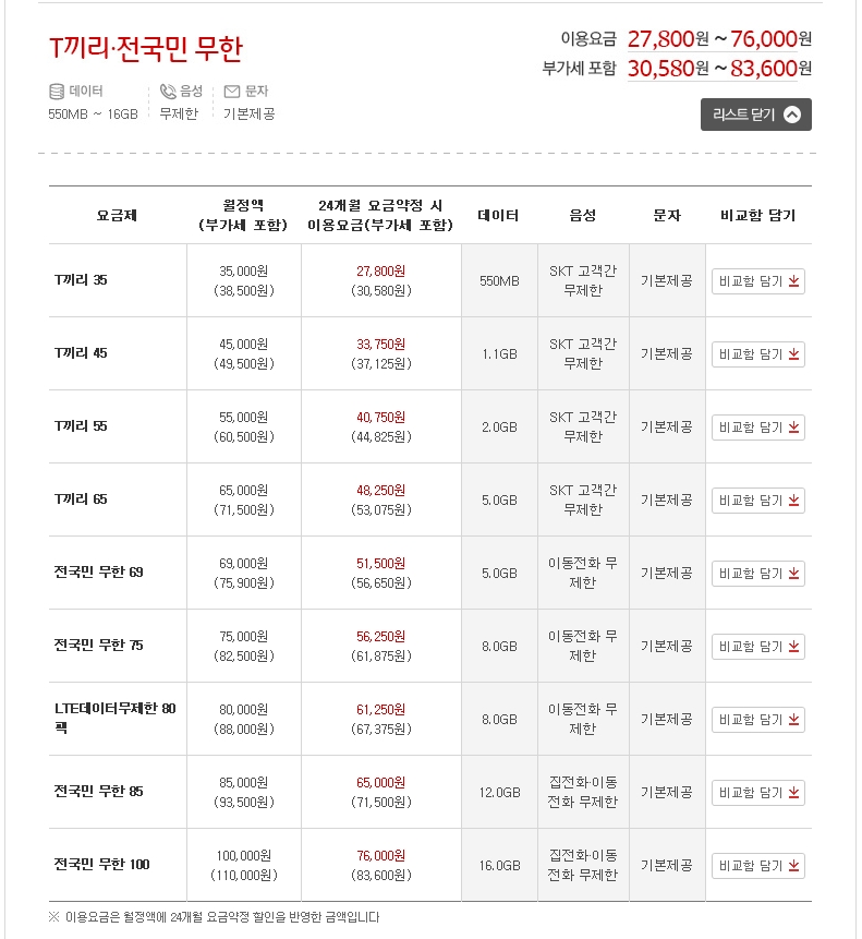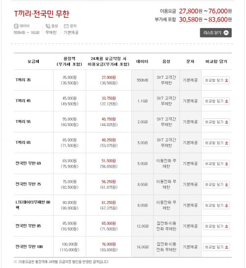 사이트에는 T끼리 요금제 몇개 있는거 같던데..