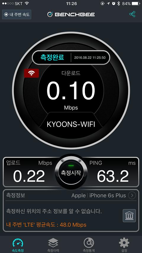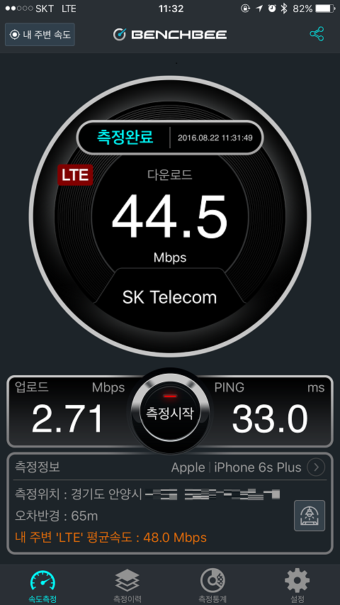 같은 자리에서 같은 SKT망 LTE 속도 측정해본 결과입니다.