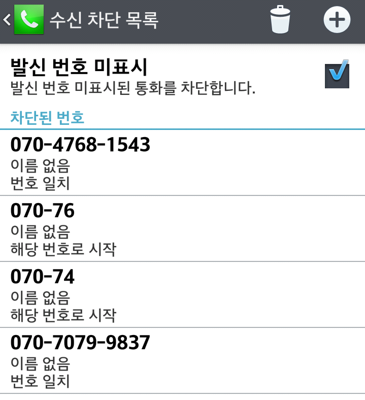 지난달 초기화해서 캡처에는 수신차단 번호가 몇개 없지만 자주 걸려오는 스팸전화는 070-XYOO-....국번 앞 두자리를 "해당 번호로 시작" 차단설정합니다.