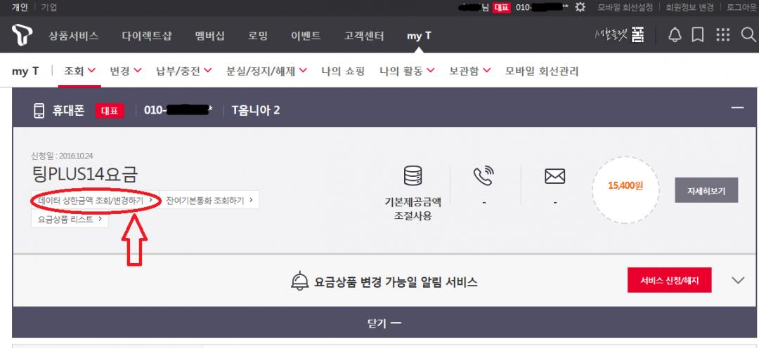 중요사항 (1) - ‘조회’에 가서 ‘데이터상한금액조회/변경’에서 1만5천원으로 변경합니다.(그림참조)