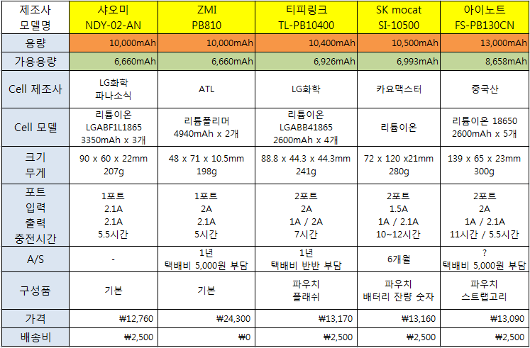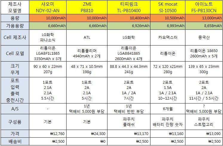 샤오미가 꽤 가볍네요. 가격은 파우치가 없는걸 감안하면 zmi말고는 비슷비슷한듯하고...ZMi는 가격이 ㅡ.ㅡ |