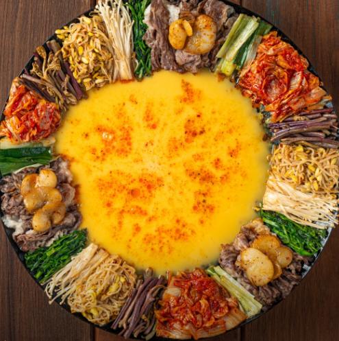 한우 차돌박이 구절판은 1++ 한우 차돌박이와 키조개관자, 미나리, 팽이버섯, 대파, 콩나물, 고사리 등 다양한 재료를 원형으로 배치하여 구워내는 요리 입니다.