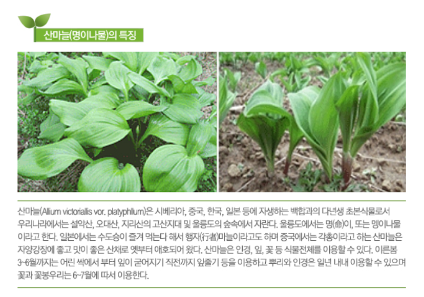 산마늘은 '명이나물'이라는 이름으로도 잘 알려져 있습니다.
