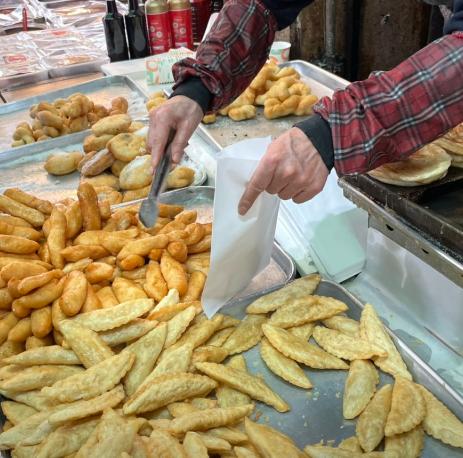 만두, 찹쌀 도넛, 단판 도넛, 꽈배기 등 여러 종류의 도넛 위에 설탕이나 깨를 뿌려서 냅니다