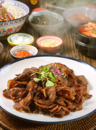 숯불 직화로 구워낸 풍부한 불향과 달짝지근한 양념이 조화된 돼지불백이 대표입니다.