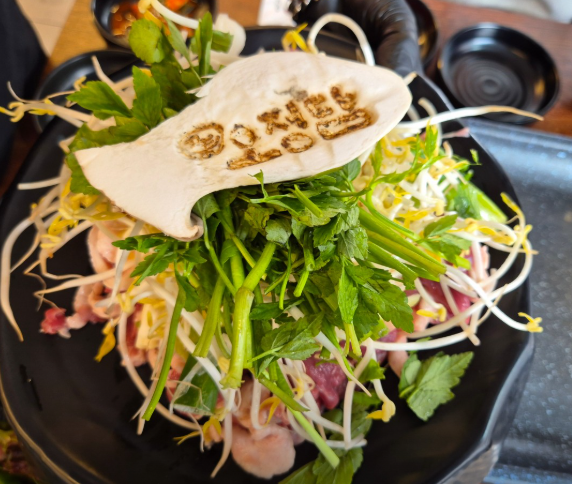 고추장 베이스 양념에 채소와 오리고기가 어우러져 진한 풍미를 냅니다.