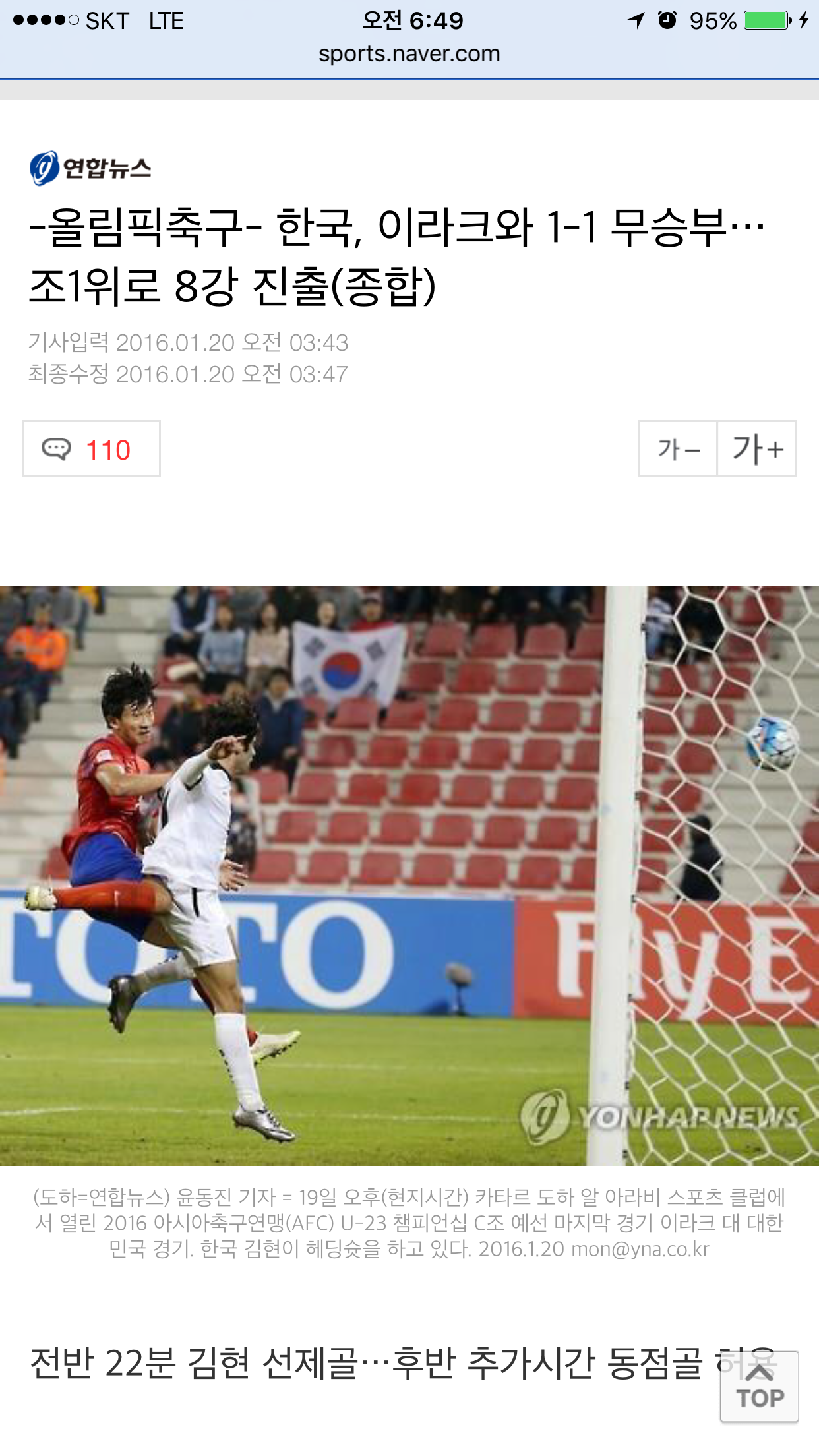 올림픽팀 이라크와 1:1 조 1위로 8강 진출 했습니다.