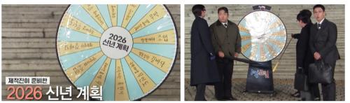 새해 첫 여행을 맞이한 '1박 2일' 제작진이 멤버들을 깜짝 놀라게 할 특별한 준비물을 선보였습니다. '2026년 신년 계획'이라는 문구가 적힌 돌림판이 등장하자 멤버들은 어리둥절한 반응을 보였습니다.