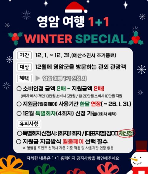 12월 영암 여행은 눈 덮인 월출산 설경과 감성적인 무화정 풍경을 함께 즐길 수 있는 겨울 대표 여행코스로 꼽힙니다 월출산은 정상에서 내려다보는 설경이 아름답기로 유명하며 등산로 중 일부 구간은 초보자도 오르기 쉬운 코스로 정비되어 있습니다 무화정은 월출산 자락에 위치한 한옥형 카페 겸 전통문화 체험 공간으로 따뜻한 차와 지역 특산품을 함께 즐길 수 있습니다 영암 여행 시 1+1 겨울 혜택 행사가 진행되어 동반 방문객은 할인 또는 무료입장이 가능하며 지역 숙박시설에서도 연계 이벤트를 운영 중입니다 12월 영암은 관광객이 많지 않아 한적하게 설경을 즐기기에 좋고 맑은 날에는 월출산 정상에서 남해안까지 조망이 가능합니다 무화정 주변에는 전통한옥 거리와 작은 갤러리들이 있어 감성 사진 명소로도 인기가 높습니다 12월 영암 여행 코스로는 월출산 국립공원 무화정 도갑사 영암 도기박물관 등이 추천되며 겨울철 방문객을 위한 온돌체험 프로그램도 운영됩니다 영암 설경 여행은 따뜻한 남도 정취와 겨울 감성을 동시에 느낄 수 있는 코스로 가족 연인 친구 모두에게 좋은 추억이 될 것입니다