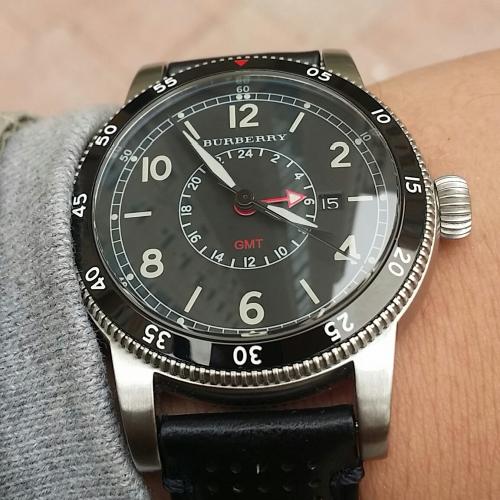 버버리 gmt입니다. 스포티한 타공 가죽 스트랩 양파용두 에타 쿼츠 2타임 존 사피아어 글래스입니다.