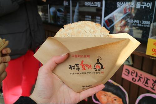 한옥마을 안에서 치즈닭꼬치, 전동 호떡