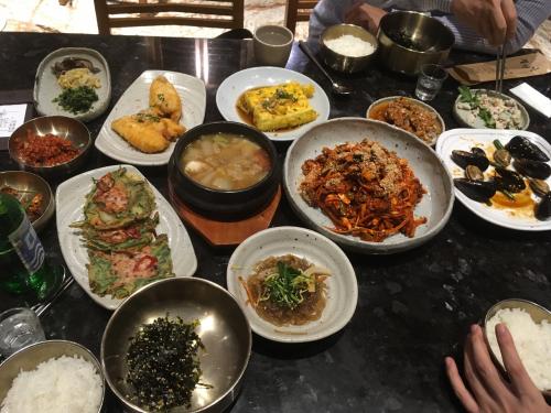 멸치볶음 생선튀김 꼬막전 꼬막양념 꼬막무침 가자미식해 꽃게된장국등의 찬들이 주르륵 한상입니다
