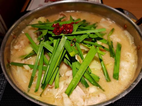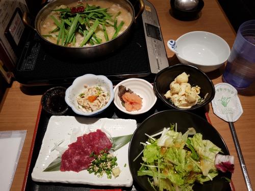 후쿠오카 명물 대창전골입니다.1인 정식으로 시키면 말 육회와 닭껍질 폰즈쉬폰도 먹을 수 있습니다.